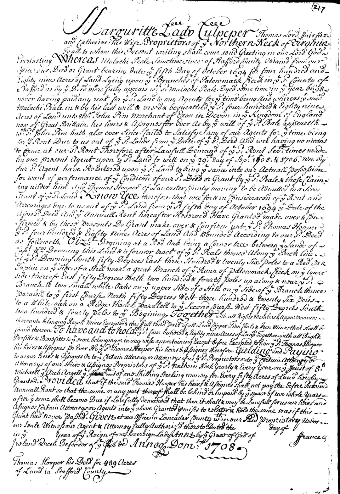 S0507--Land Grant--1708--Virginia--Thomas Hooper--p217