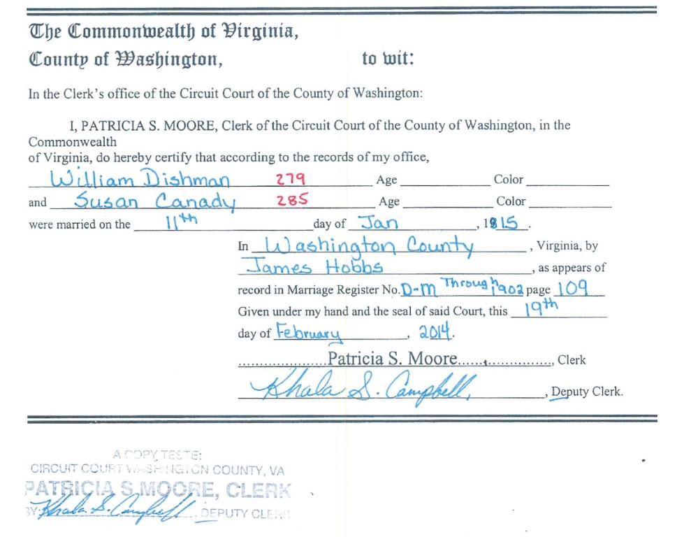 - [S525] Washington County, Virginia, Marriage Record Abstract, William Dishman and Susan Canady, 11 Jun 1815.
