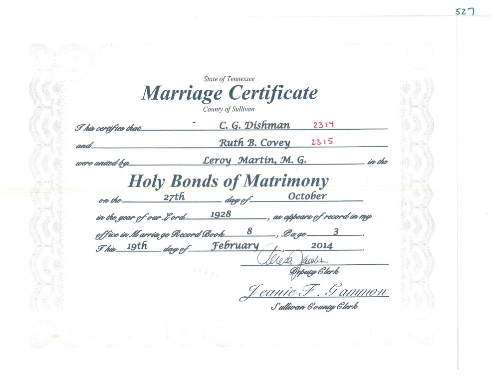 - [S527] Sullivan County, Tennessee, Marriage Record Abstract, C. G. Dishman and Ruth B. Covey, 27 Oct 1928.