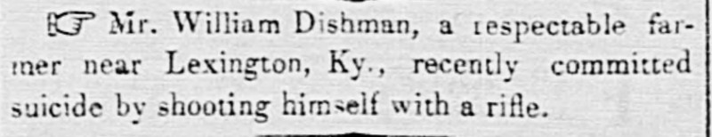 - [S537] "By This Morning's Mail,"William Dishman suicide, New York Daily Tribune, New York City, New York, 12 Oct 1842, p.2 (https://www.newspapers.com/image/79064558 : accessed 27 May 2025); citing Newspapers.com.