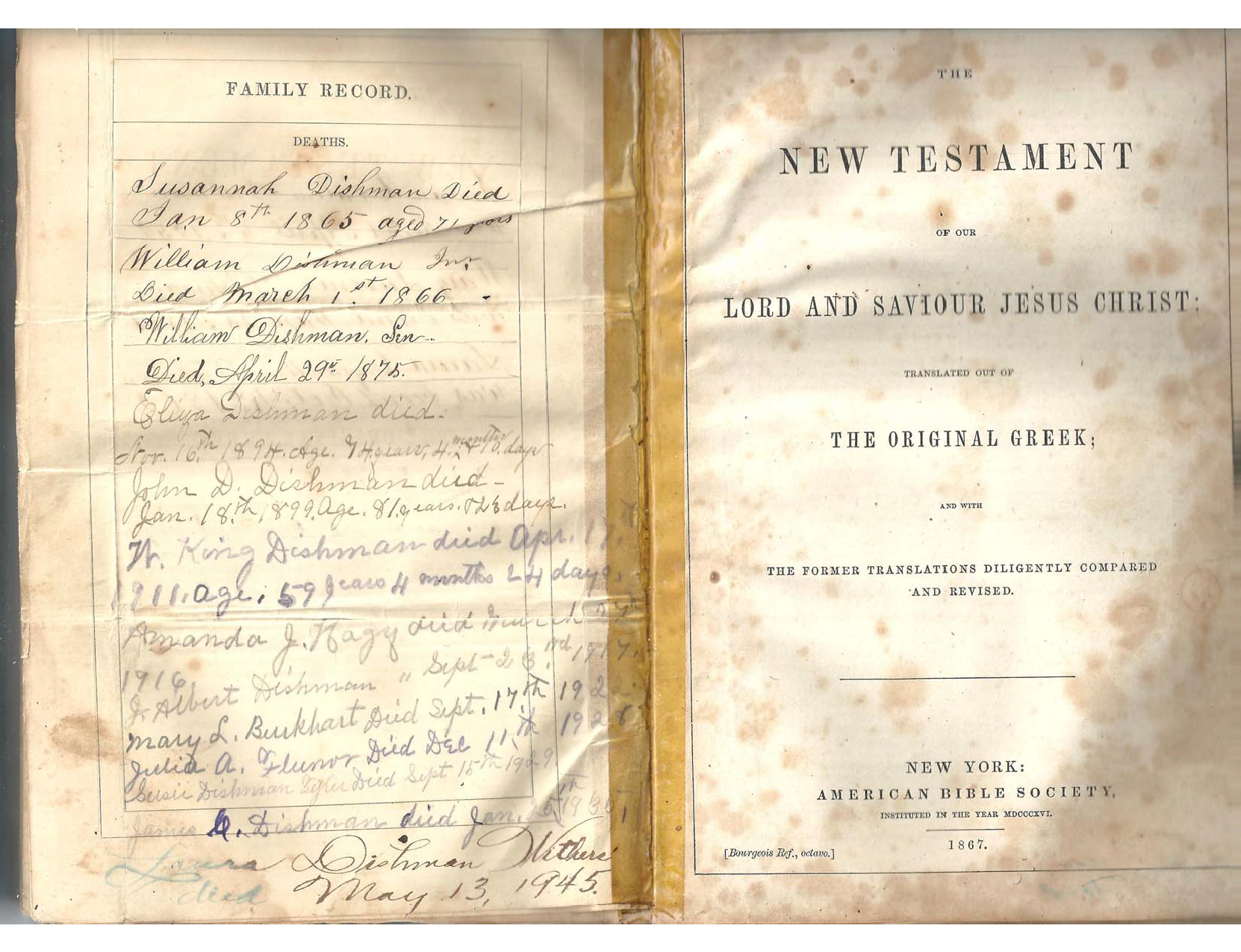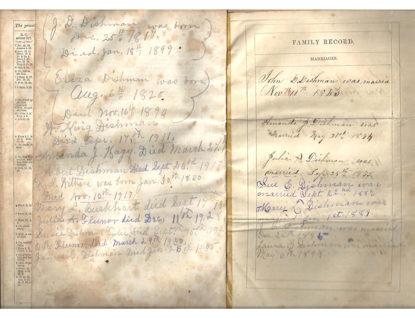 - [S667] John D. Dishman Family Bible Record, 1817-1945, Holy Bible (New York: American Bible Society, 1867), "Births, Marriages, and Deaths"; Clarence Gilmer Dishman Jr, Washington County, Virginia, 2016. Entries appear to have been entered about 1875 based on handwriting, transcribed by Keith Dishman in 2016.