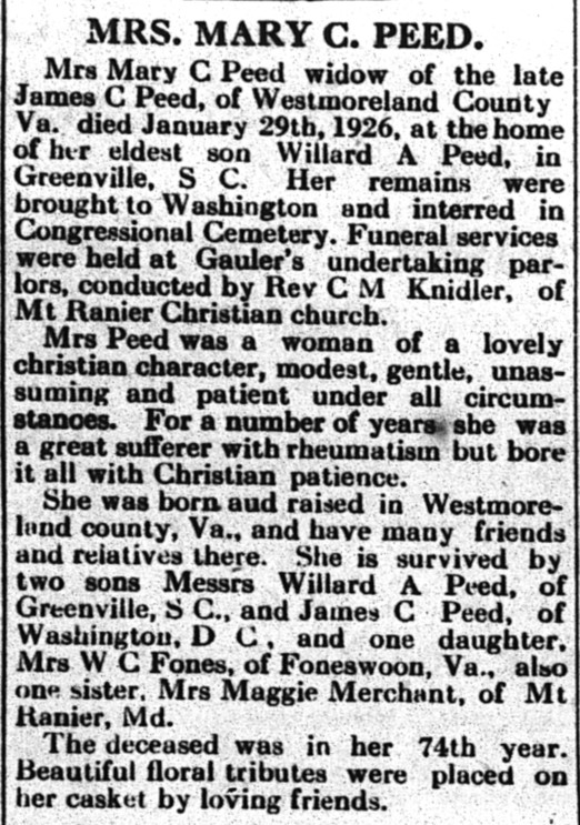 S0688--Obit--1926-03-05--Northern Neck News--Mary C. Peed
