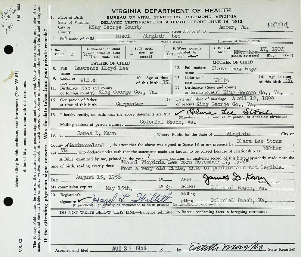 - [S700] Virginia Department of Health, Certificate of Birth 8694 (1956), Hazel Virginia Lee; Department of Health, Bureau of Vital Statistics, Richmond, Virginia.