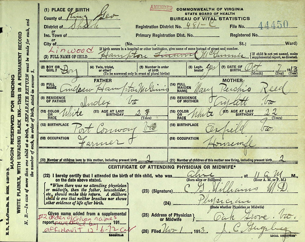 - [S701] Virginia Department of Health, Certificate of Birth (amended) 44450 (1913), Linwood Hampton Mcginnis; Department of Health, Bureau of Vital Statistics, Richmond, Virginia.