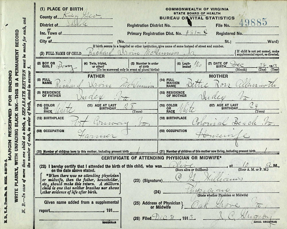 - [S703] Virginia Department of Health, Certificate of Birth 49885 (1913), Richard Irvin Mcginniss Jr; Department of Health, Bureau of Vital Statistics, Richmond, Virginia.
