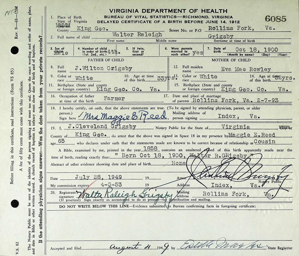 - [S705] Virginia Department of Health, Certificate of Birth 6085 (1949), Walter Raleigh Grigsby; Department of Health, Bureau of Vital Statistics, Richmond, Virginia.