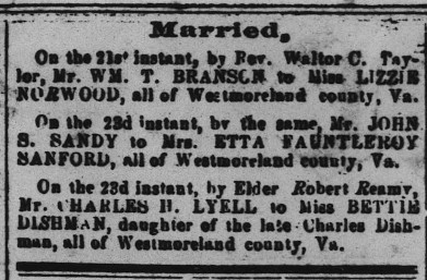 - [S711] "Married,"Charles Lyell and Bettie Dishman marriage, The Virginia Herald, Fredericksburg, Virginia, 2 Mar 1871, p.2 (https://www.virginiachronicle.com/?a=d&d=VHR18710302.1.2 : accessed 29 May 2025); citing Virginia Chronicle - Digital Newspaper Archive.