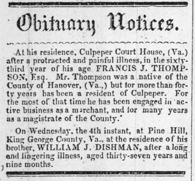 - [S712] "Obituary Notices,"William J. Dishman, The Virginia Herald, Fredericksburg, Virginia, 16 Apr 1855, p.3 c.1 (https://www.virginiachronicle.com/?a=d&d=VHR18550416.1.3 : accessed 24 May 2025); citing Virginia Chronicle - Digital Newspaper Archive.