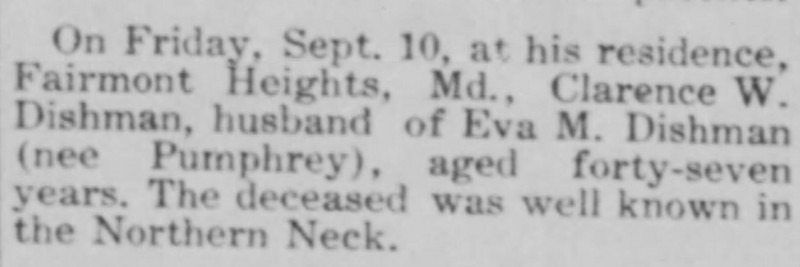 - [S715] "Deaths,"Clarence W. Dishman, The Free Lance-Star, Fredericksburg, Virginia, 14 Sep 1909 (https://www.newspapers.com/image/71213021 : accessed 12 May 2025); citing Newspapers.com.
