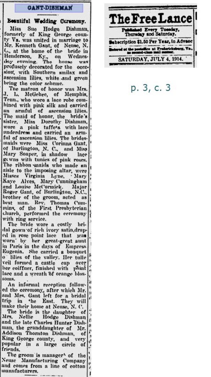 - [S716] "GANT-DISHMAN, Beautiful Wedding Ceremony,"Sue Dishman and Kenneth Gant marriage, The Free Lance-Star, Fredericksburg, Virginia, 4 Jul 1914, p.3 (https://www.newspapers.com/image/867550789 : accessed 27 May 2025); citing Newspapers.com.