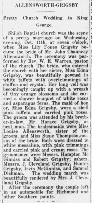 - [S723] "Allensworth-Grigsby, Pretty Church Wedding in King George,"Lily Fones Grigsby and John C. Allensworth marriage, The Daily Star, Fredericksburg, Virginia, 18 Oct 1916, p.2 (https://www.virginiachronicle.com/?a=d&d=DS19161018.1.2 : accessed 28 May 2025); citing Virginia Chronicle - Digital Newspaper Archive.