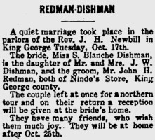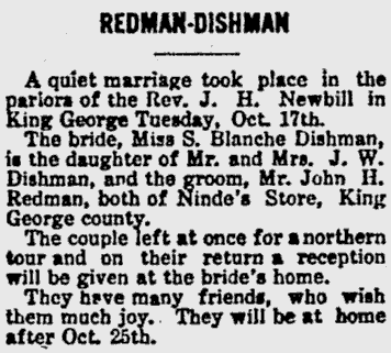 - [S724] "Redman-Dishman,"Blanche Dishman and John Redman marriage, The Daily Star, Fredericksburg, Virginia, 19 Oct 1911, p.2 (https://www.virginiachronicle.com/?a=d&d=DS19111019.1.2 : accessed 28 May 2025); citing Virginia Chronicle - Digital Newspaper Archive.