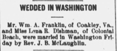 - [S725] "Wedded in Washington,"William Franklin and Lena R. Dishman marriage, The Daily Star, Fredericksburg, Virginia, 27 Jun 1908, p.3 (https://www.virginiachronicle.com/?a=d&d=DS19080627.1.3 : accessed 28 May 2025); citing Virginia Chronicle - Digital Newspaper Archive.