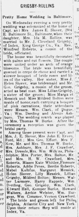 - [S726] "Grigsby-Rollins, Pretty Home Wedding in Baltimore,"Ida Rollins and Cleveland Grigsby marriage, The Daily Star, Fredericksburg, Virginia, 7 Sep 1914, p.2 (https://www.virginiachronicle.com/?a=d&d=DS19140907.1.2 : accessed 28 May 2025); citing Virginia Chronicle - Digital Newspaper Archive.