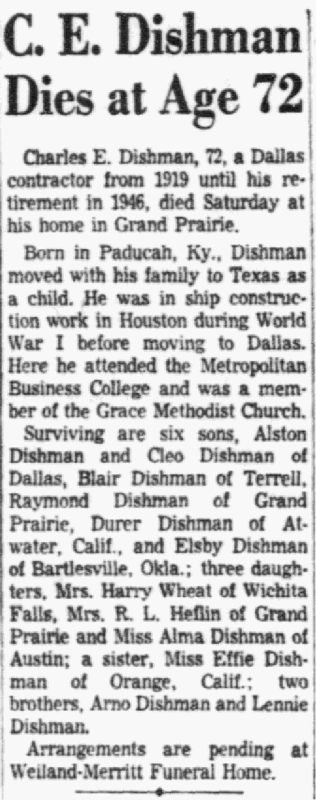 - [S744] "C.E. Dishman Dies at Age 72,"Charles E. Dishman, Dallas Morning News, Dallas, Dallas County, Texas, 6 Dec 1953 (https://www.genealogybank.com/doc/newspapers/image/v2%3A0F99DDB671832188%40GB3NEWS-1015C2C4D189F701%402434718-1015C2C504787E20%4018-1015C2C707BF50FF%40C.%2BE.%2BDishman%2BDies%2Bat%2BAge%2B72?lname=dishman&fname=c.%20e.&dateType=range&formDateFlex=exact&rgtoDate=1953&rgfromDate=1953 : accessed 7 Jan 2017); citing GenealogyBank.com.