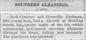 - [S536] "Southern Gleanings,"Granville Dishman murder, Bolivar Bulletin, Bolivar, Tennessee, 30 Oct 1879, p.4 (https://www.newspapers.com/image/70827345 : accessed 26 May 2025); citing Virginia Chronicle - Digital Newspaper Archive.