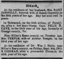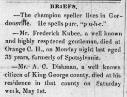 - [S708] "Briefs,"A. C. Dishman, The Virginia Herald, Fredericksburg, Virginia, 10 May 1875, p.3 c.1 (https://www.virginiachronicle.com/?a=d&d=VHR18750510.1.3 : accessed 24 May 2025); citing Virginia Chronicle - Digital Newspaper Archive.