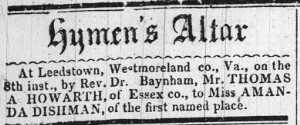 - [S710] "Hymen's Altar,"Thomas Howarth and Amanda Dishman marriage, The Virginia Herald, Fredericksburg, Virginia, 8 Feb 1855, p.3 c.1 (https://www.virginiachronicle.com/?a=d&d=VHR18550226.1.3 : accessed 29 May 2025); citing Virginia Chronicle - Digital Newspaper Archive.
