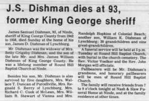 - [S737] "J.S. Dishman dies at 93, former King George Sheriff,"James Samuel Dishman, The Free Lance-Star, Fredericksburg, Virginia, 9 Apr 1979 (https://www.newspapers.com/image/1141543713 : accessed 11 May 2025); citing Newspapers.com.
