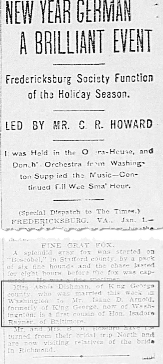- [S756] "New Year German A Brilliant Event,"Abbie Dishman and Isaac Arnold marriage, Richmond Times-Dispatch, Richmond, Virginia, 2 Jan 1903, p.6 (https://www.newspapers.com/image/79972088 : accessed 29 May 2025); citing Newspapers.com.