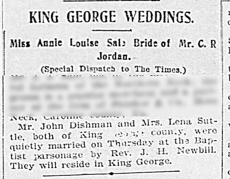 - [S758] "King George Weddings,"John Dishman and Lena Suttle marriage, Richmond Times-Dispatch, Richmond, Virginia, 29 Dec 1901, p.16 (https://www.newspapers.com/image/81019899 : accessed 29 May 2025); citing Newspapers.com.