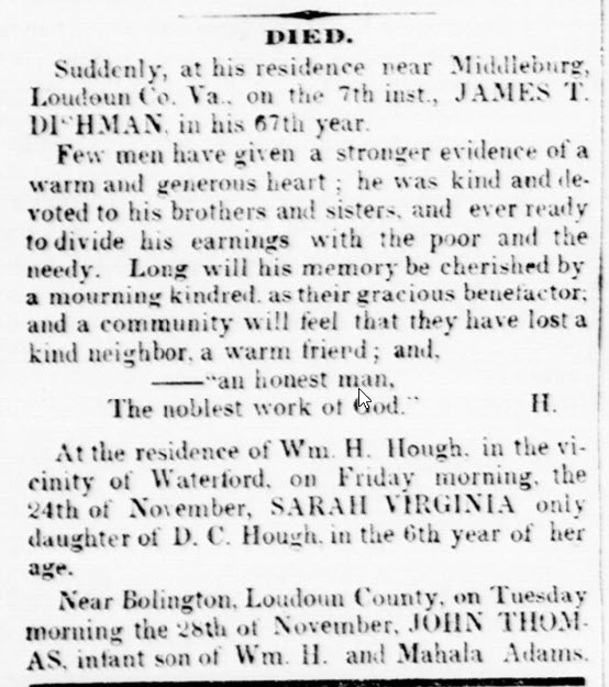- [S759] "Died," James T. Dishman, Alexandria Gazette, Alexandria, Alexandria County, Virginia, 15 Dec 1854, p.3; citing Chronicling America.