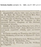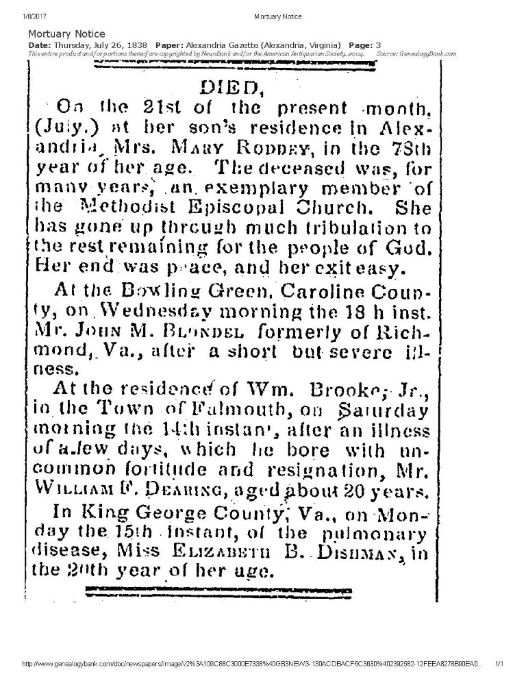 - [S761] "Died," Elixabeth B. Dishman, Alexandria Gazette, Alexandria, Alexandria County, Virginia, 26 Jul 1838, p.3; citing Chronicling America.