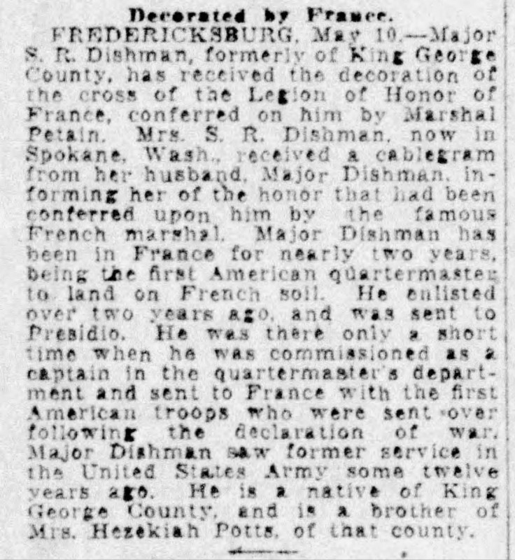- [S781] "Decorated by France,"S.R. Dishman medal, Richmond Times-Dispatch, Richmond, Virginia, 11 May 1919, p.15 (https://www.newspapers.com/image/827437387/ : accessed 28 May 2025); citing Newspapers.com.