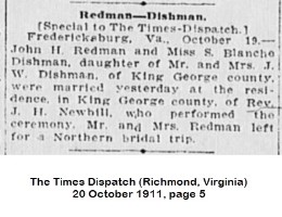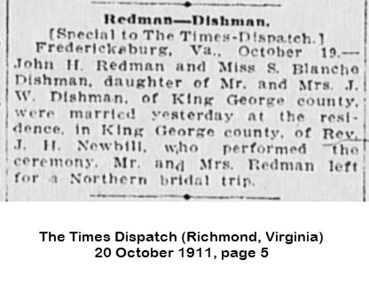 - [S802] "Redman-Dishman,"John Redman and Blanche Dishman marriage, Richmond Times-Dispatch, Richmond, Virginia, 20 Oct 1911, p.5 c.5 (https://www.newspapers.com/image/827354111 : accessed 29 May 2025); citing Newspapers.com.