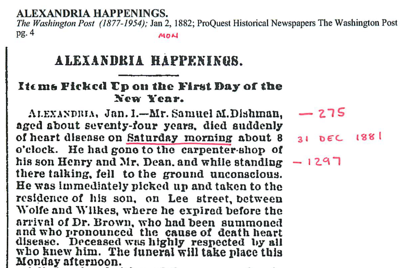 S0815 - Washington Post - 2 Jan 1882 - Samuel M. Dishman obituary