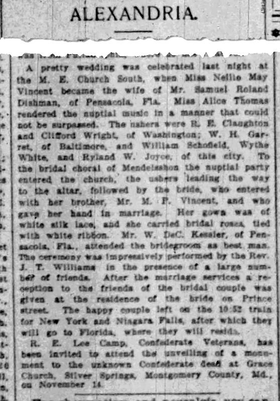 - [S816] "Alexandria,"Nellie May Vincent and Samuel R. Dishman marriage, The Washington Post, Washington, District of Columbia, 12 Nov 1896, p.8 c.7 (https://www.newspapers.com/image/1040535004 : accessed 29 May 2025); citing Newspapers.com.