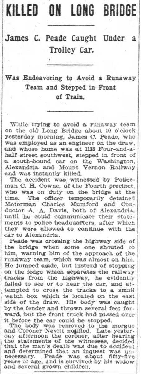 - [S820] "Killed on Long Bridge,"James C. Peade death, The Washington Post, Washington, District of Columbia, 24 Dec 1905, p.2 (https://www.newspapers.com/image/28919184 : accessed 29 May 2025); citing Newspapers.com.