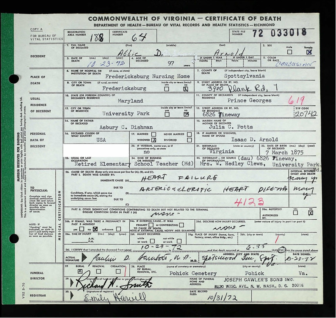 - [S822] "Licensed To Marry,"Isaac Arnold and Abbie Dishman marriage, The Washington Post, Washington, District of Columbia, 23 Dec 1902, p.3 (https://www.newspapers.com/image/1037722191 : accessed 29 May 2025); citing Newspapers.com.