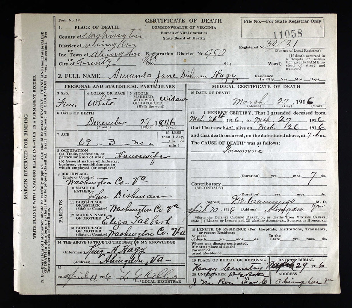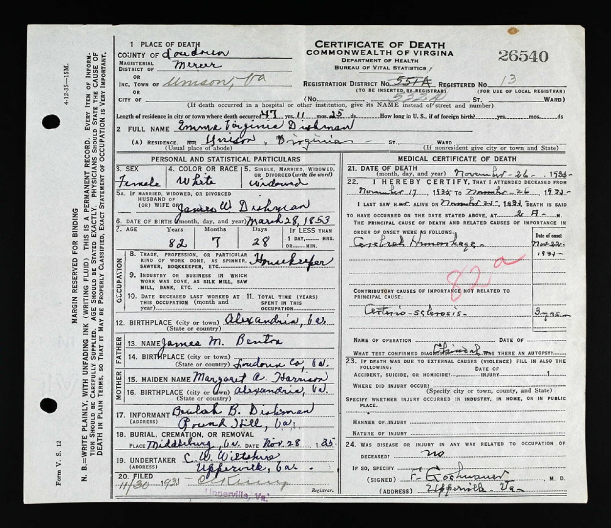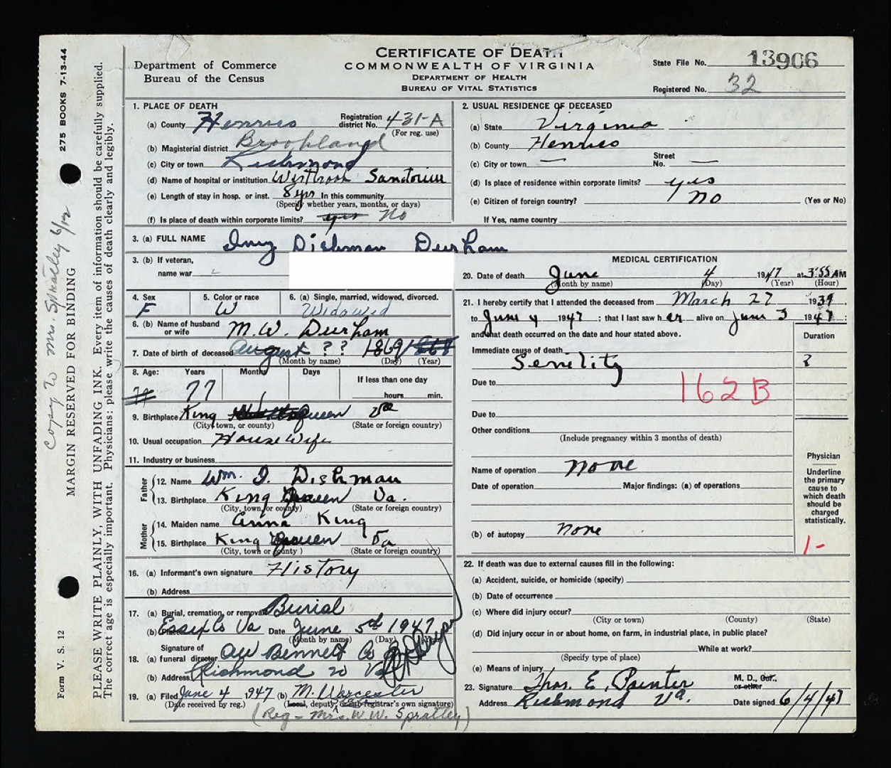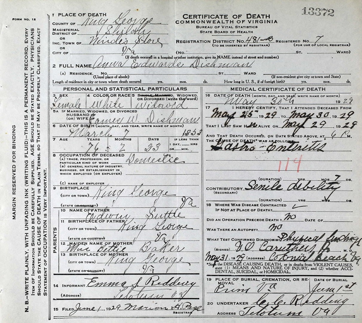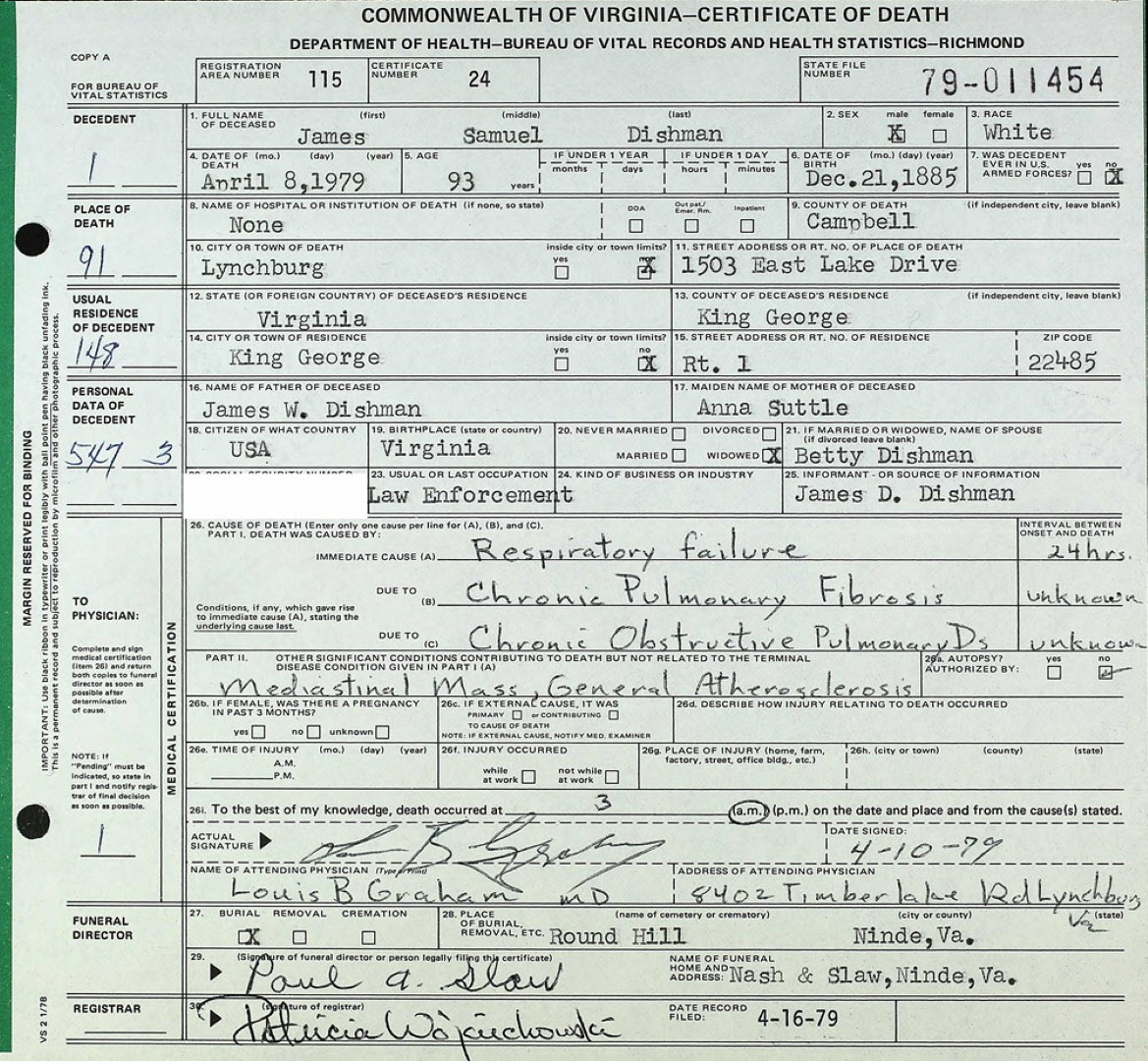 - [S973] J. H. Dishman, Certificate of Death no. 30568 (1934), Department of Health, Bureau of Vital Statistics.