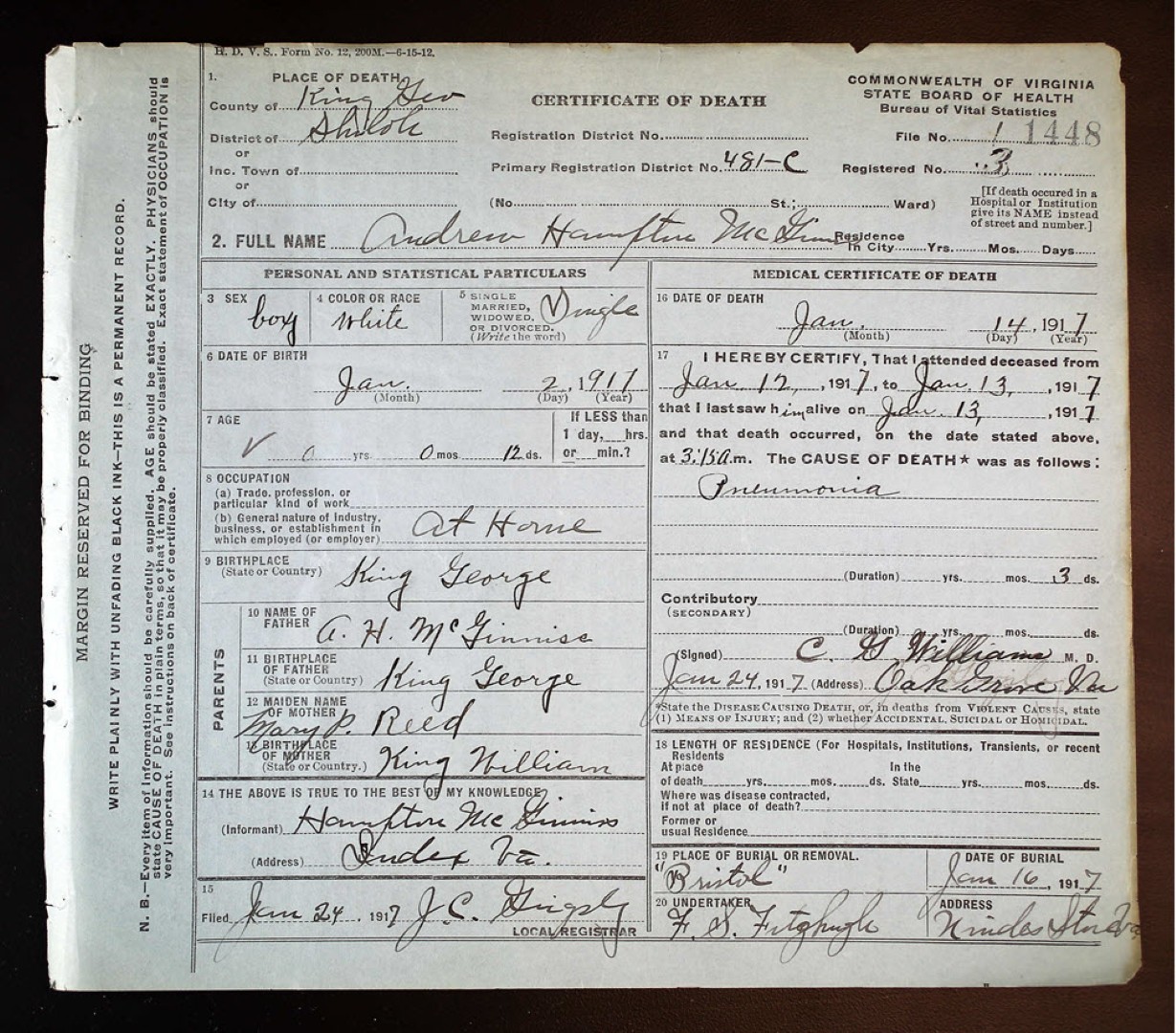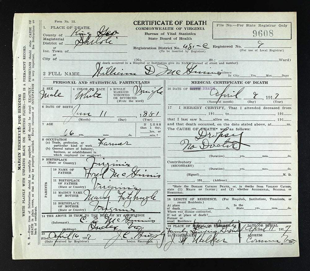 - [S950] William D. McGinnis, Certificate of Death no. 9608 (1917), Department of Health, Bureau of Vital Statistics.