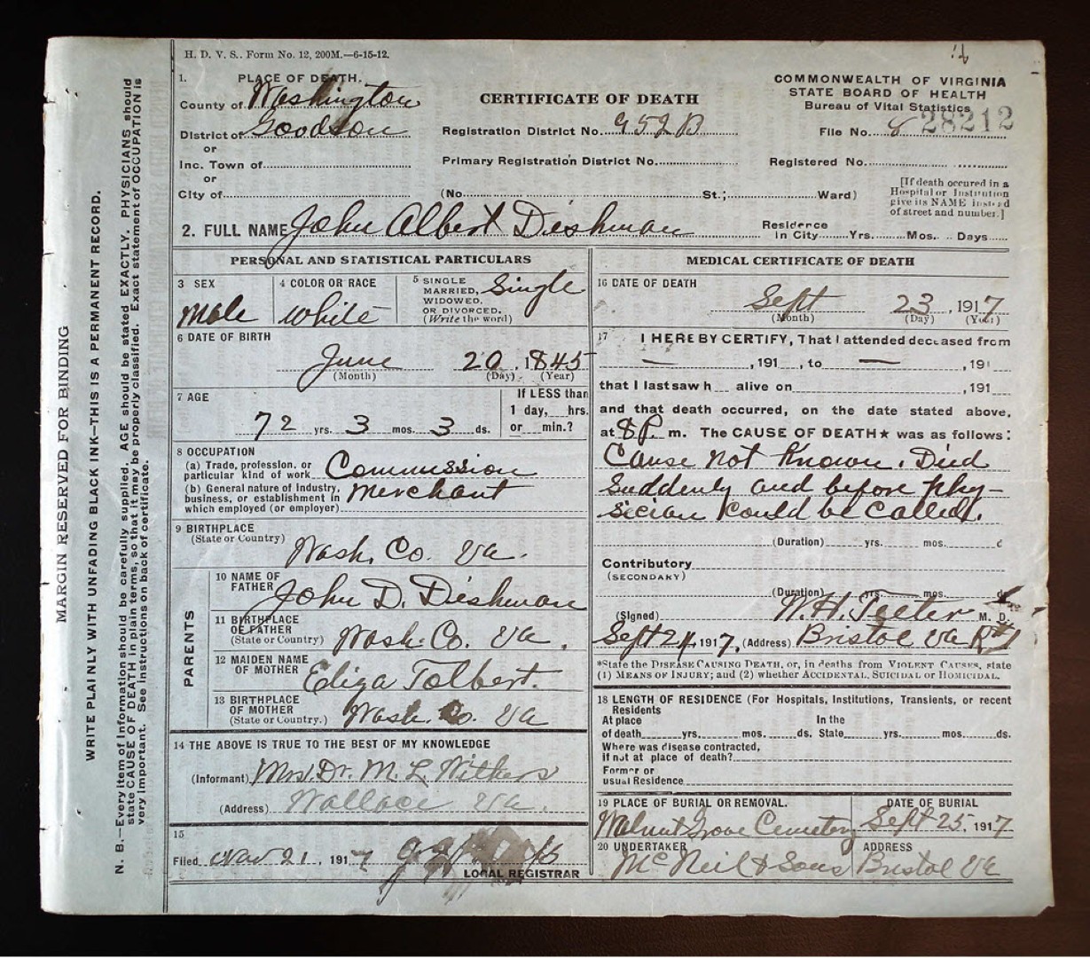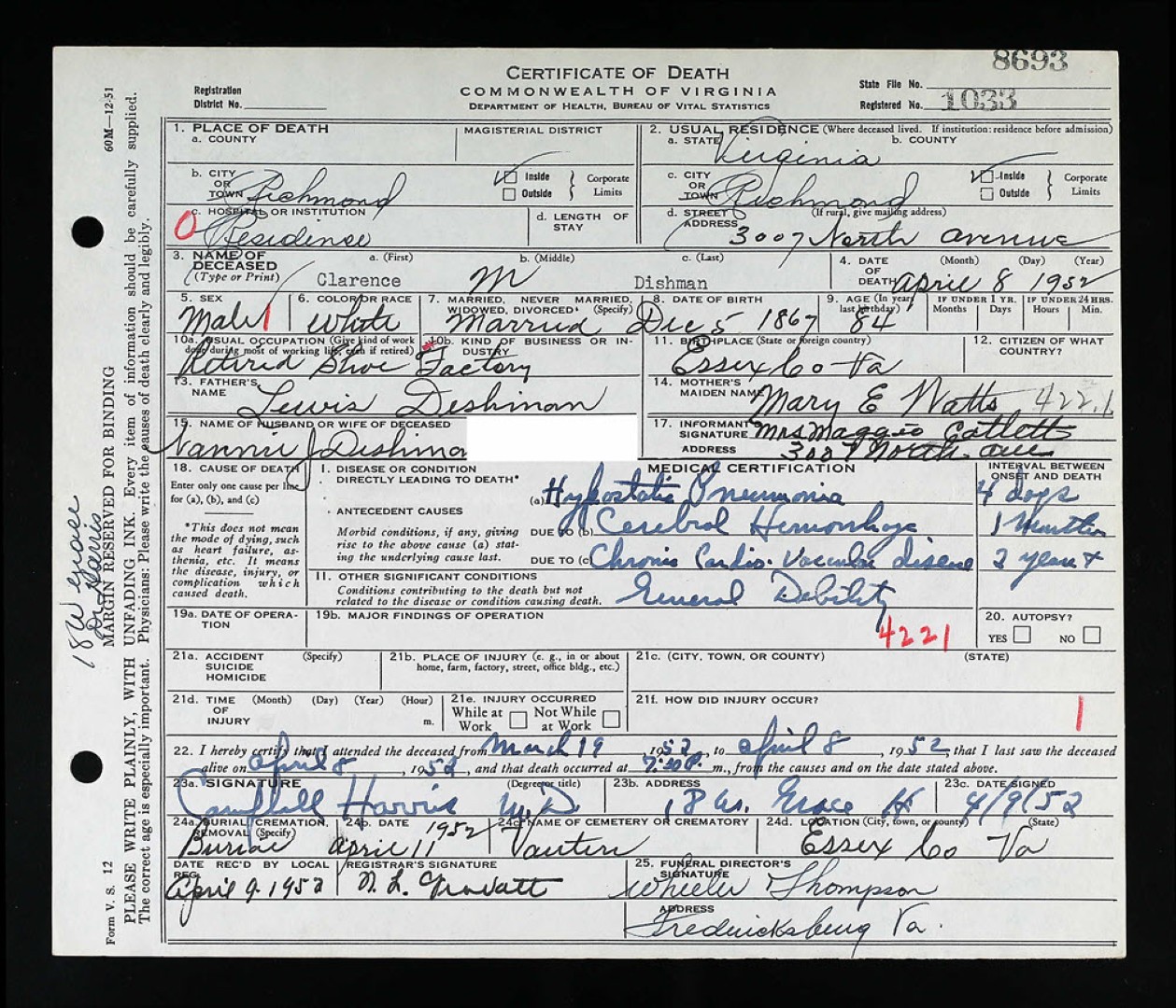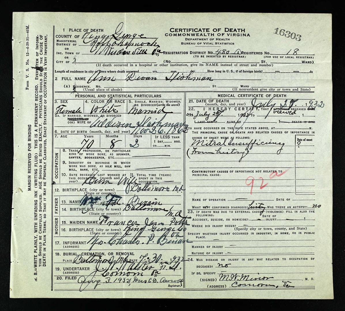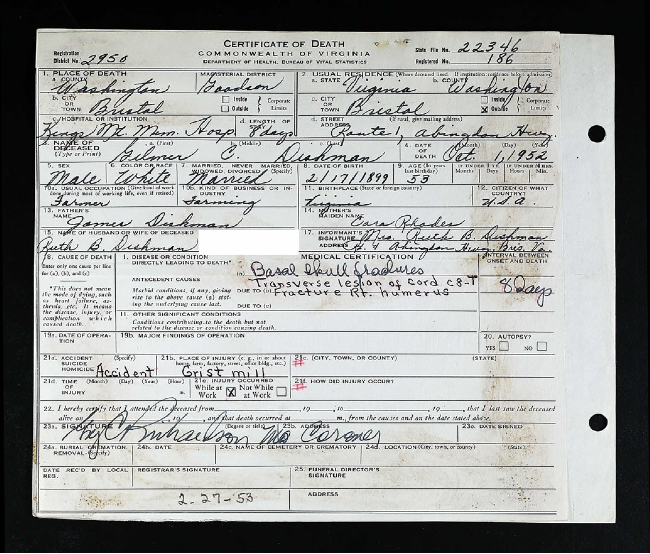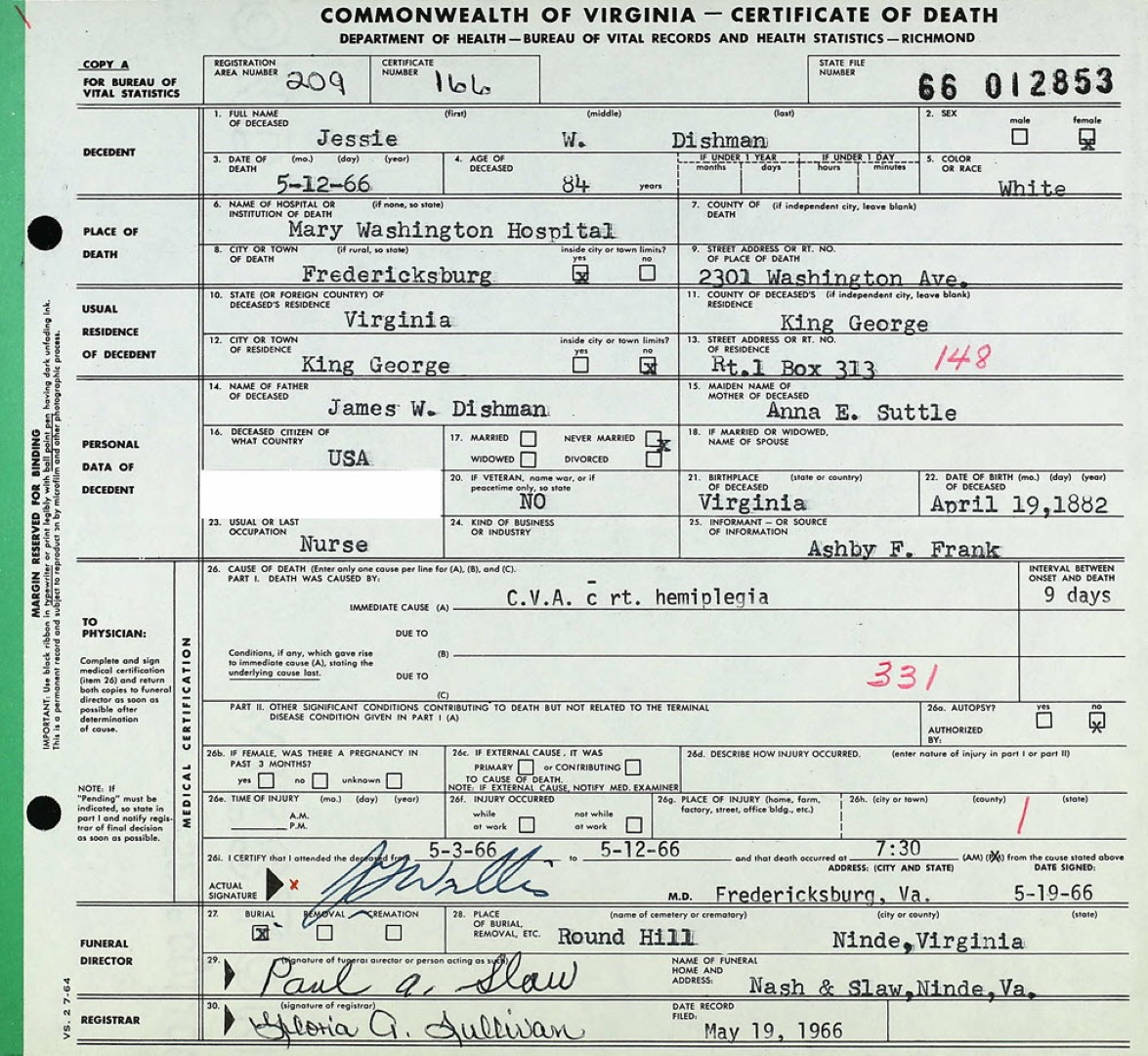 - [S962] William F. Dishman, Certificate of Death no. 9198 (1933), Board of Health, Bureau of Vital Statistics.