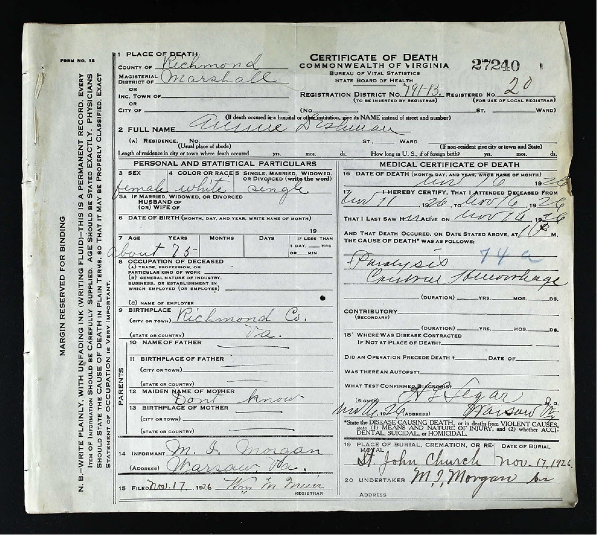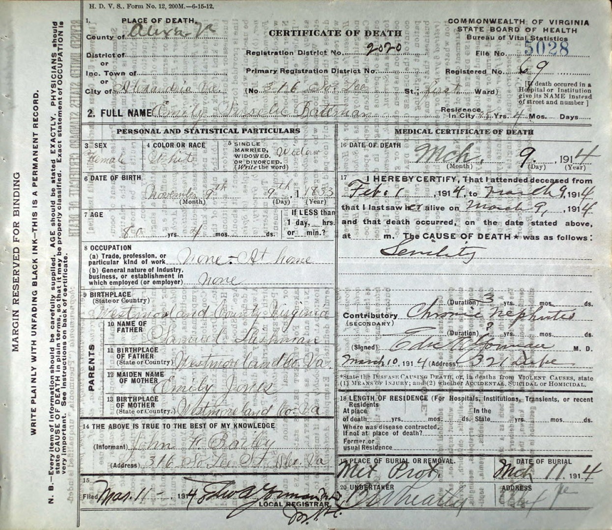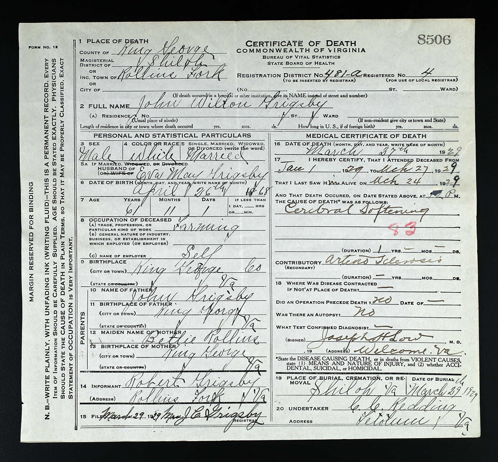 - [S985] John Wilton Grigsby, Certificate of Death no. 8506 (1929), Department of Health, Bureau of Vital Statistics.