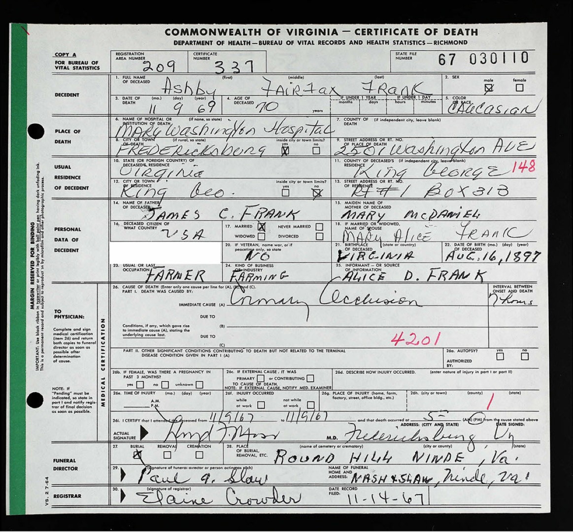 - [S908] Mary Alice Frank, Certificate of Death no. 74-009919 (1974), Department of Health, Bureau of Vital Statistics.