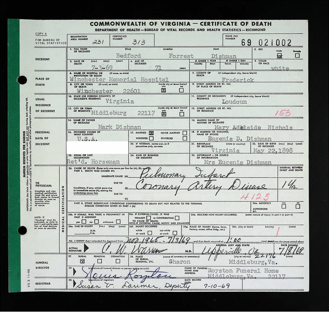 - [S818] "Deaths,"Bedford Forrest Dishman, The Evening Star, Washington, District of Columbia, 4 Jul 1969, p.23 c.5 (https://www.genealogybank.com/doc/newspapers/image/v2%3A13D5DA85AE05A305%40GB3NEWS-14E3DC1DAF4EF9DD%402440407-14E19F0E45D4950E%4022-14E19F0E45D4950E%40?lname=dishman&dateType=range&formDateFlex=exact&rgtoDate=jul%201969&rgfromDate=jul%201969 : accessed 25 May 2025); citing GenealogyBank.