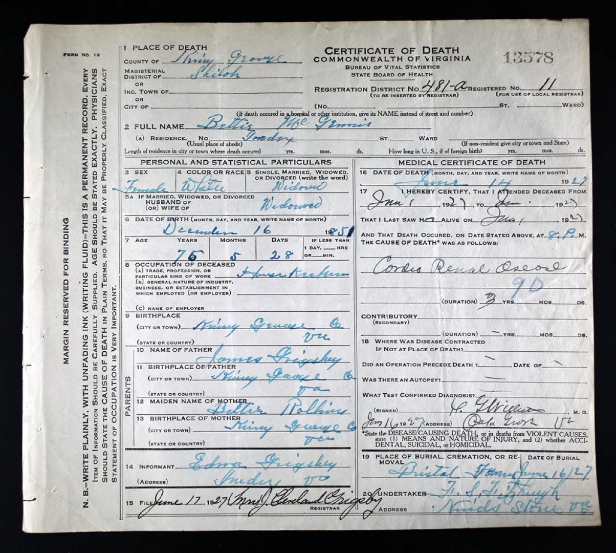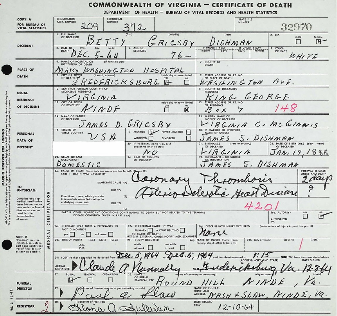 - [S751] "Obituaries," Betty G. Dishman, The King George News, King George, King George County, Virginia, 10 Dec 1964.