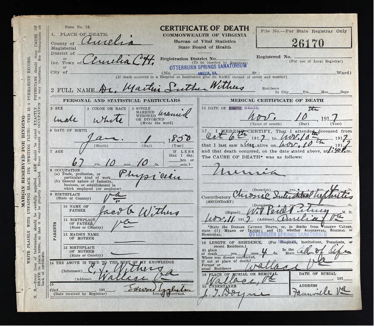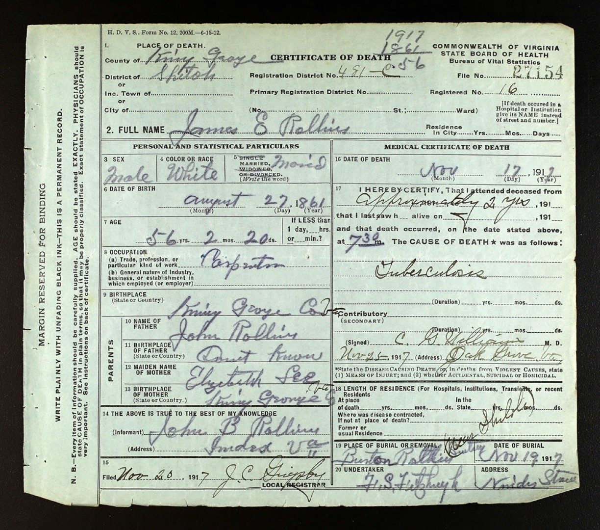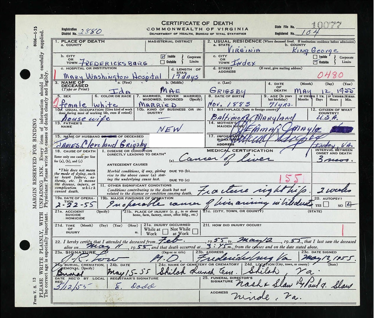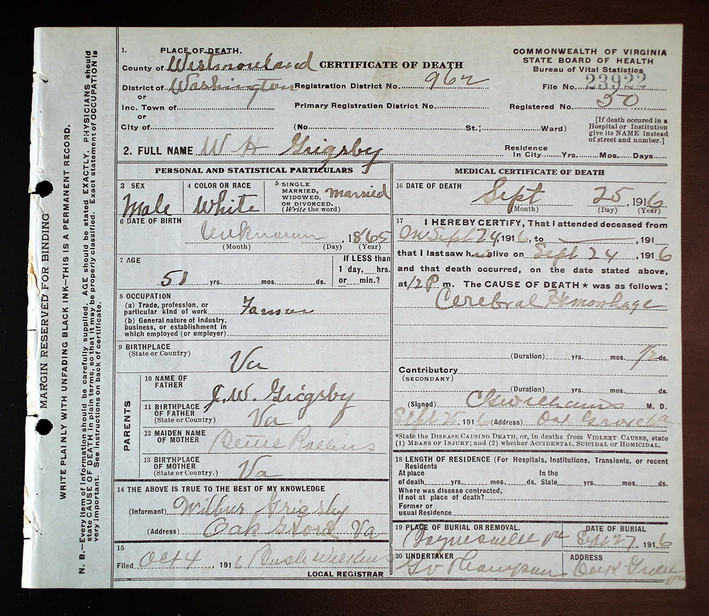 - [S984] W. H. Grigsby, Certificate of Death no. 23922 (1916), Department of Health, Bureau of Vital Statistics.