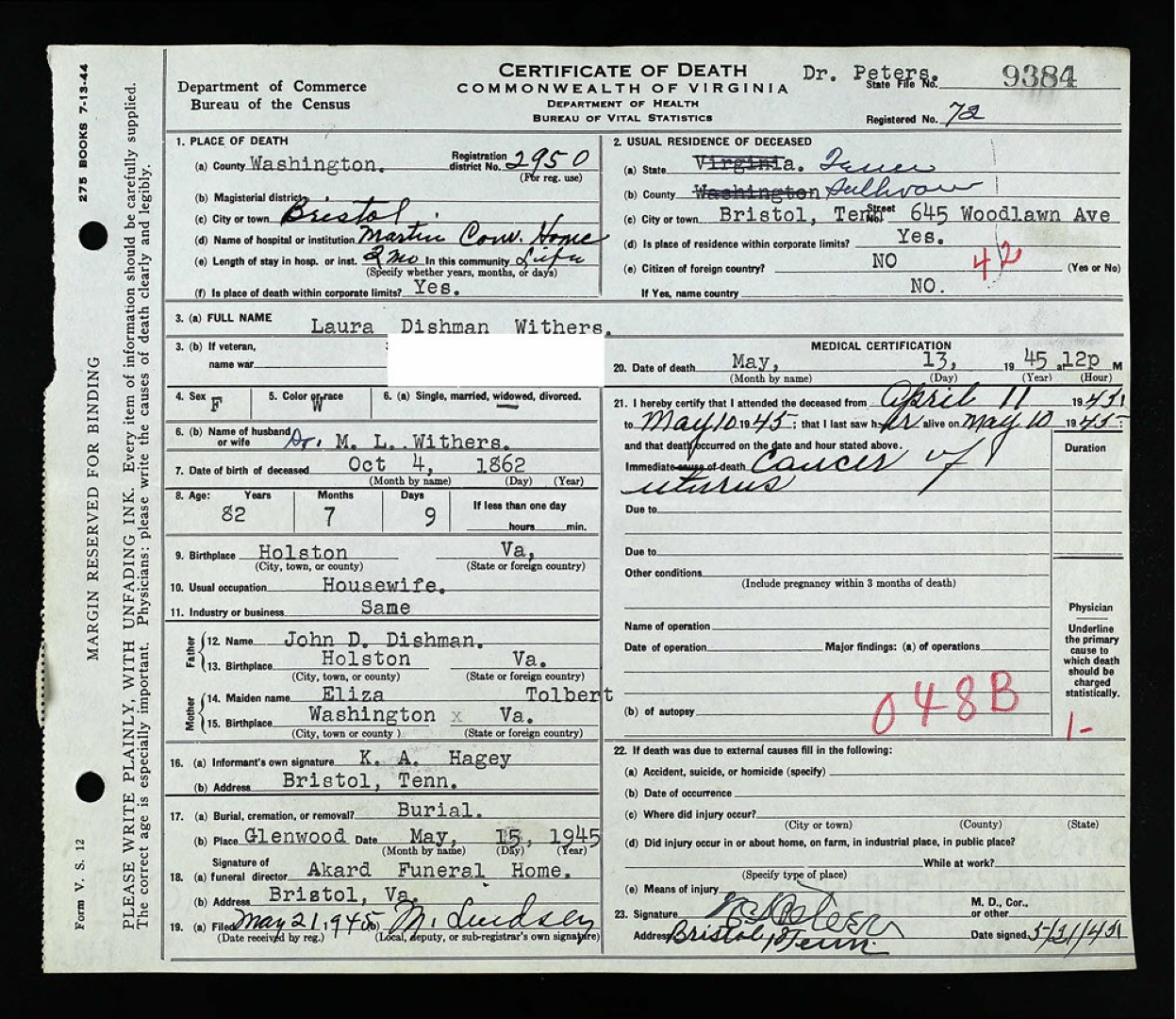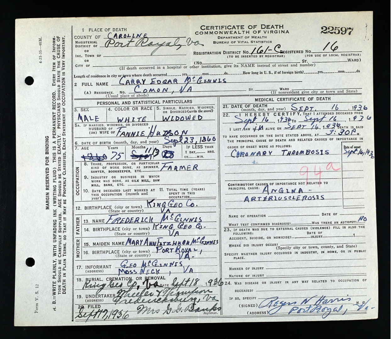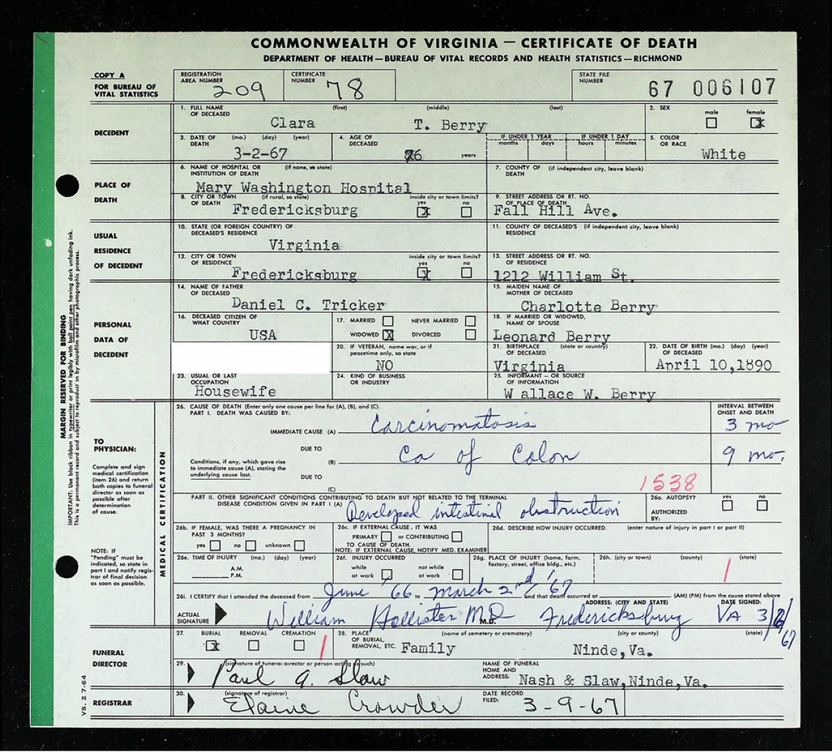 - [S984] W. H. Grigsby, Certificate of Death no. 23922 (1916), Department of Health, Bureau of Vital Statistics.