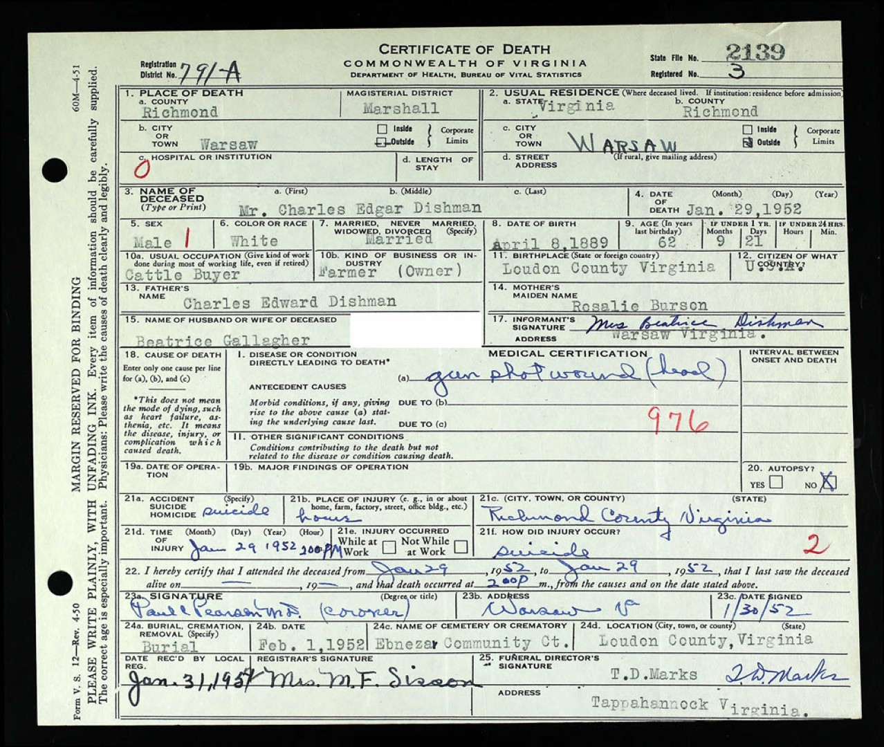 - [S989] George Washington Grigsby, Certificate of Death no. 64915 (1951), Board of Health, Bureau of Vital Statistics.