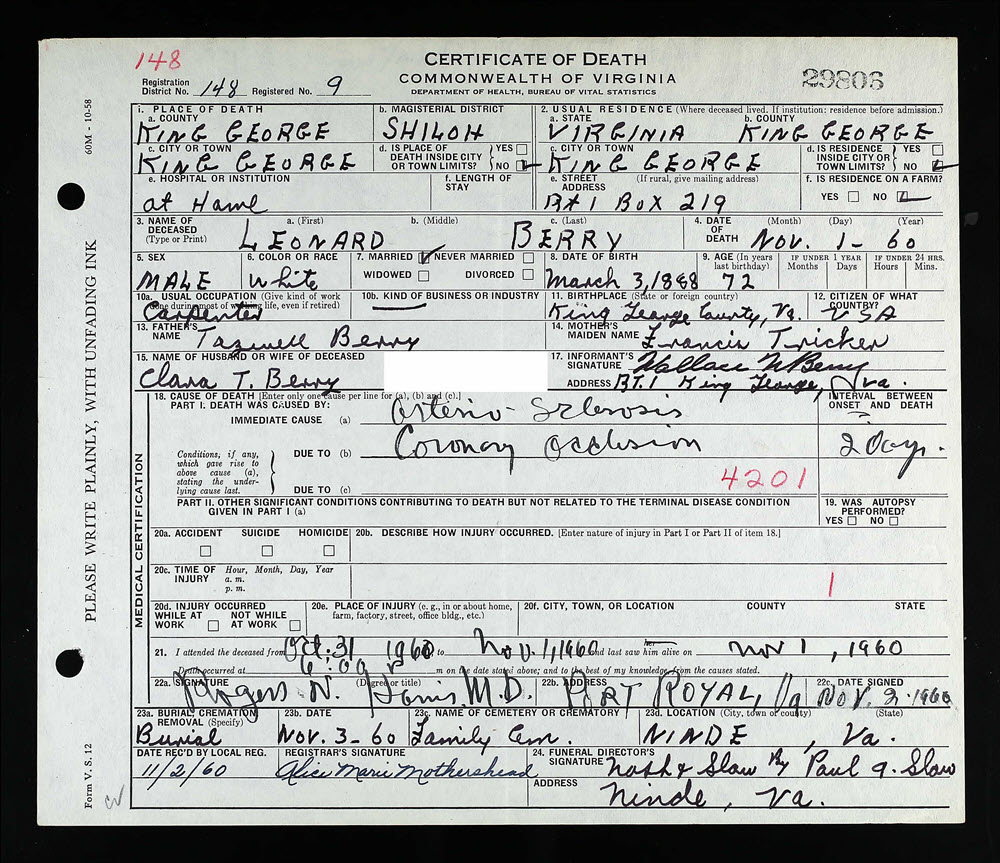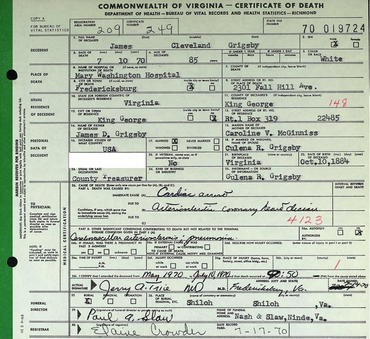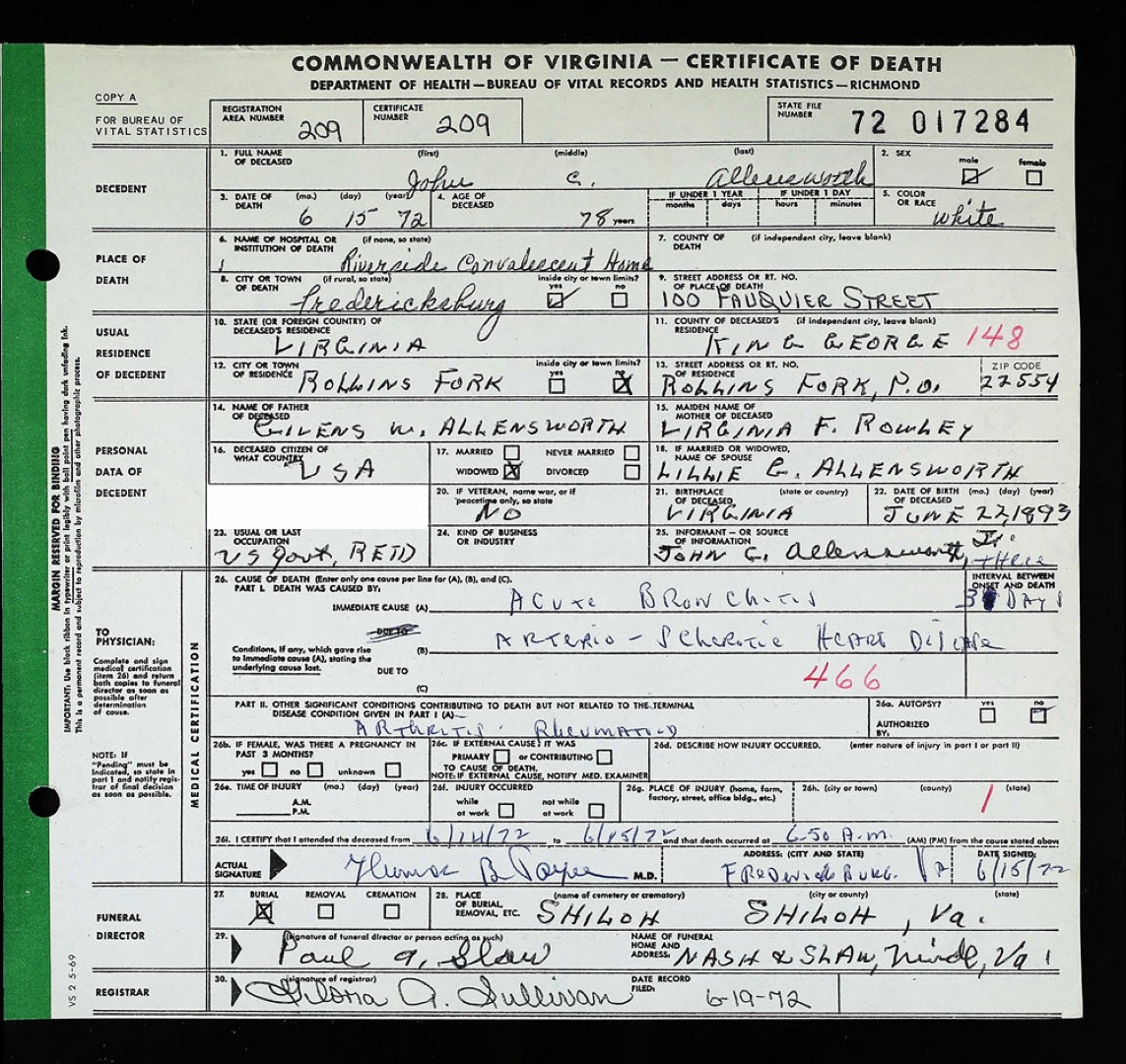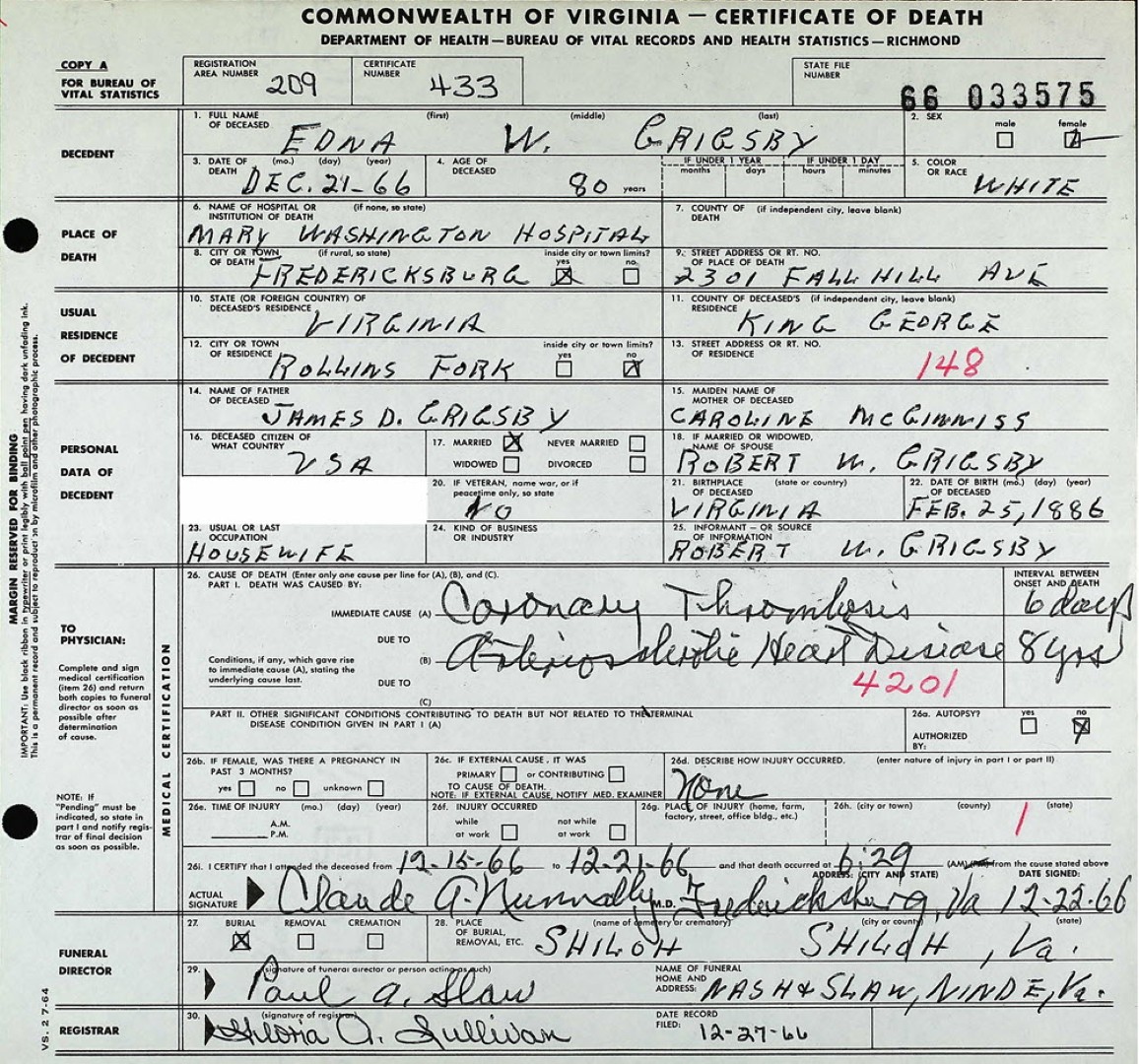 - [S754] "W.M. Grigsby Buried at Shiloh Friday Afternoon," William M. Grigsby, The King George News, King George, King George County, Virginia, 18 Jun 1959.
