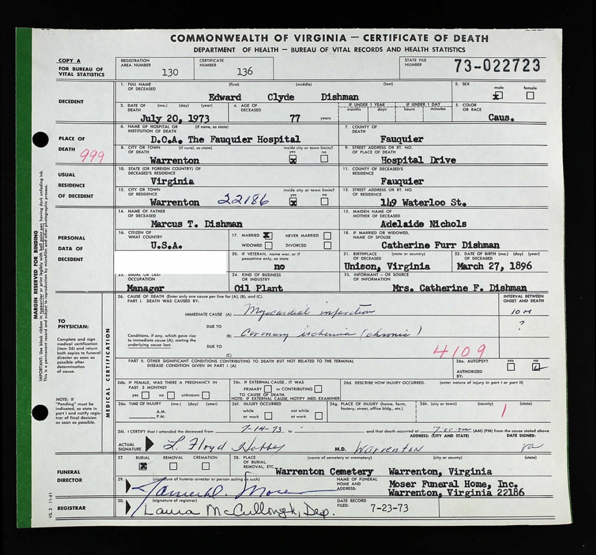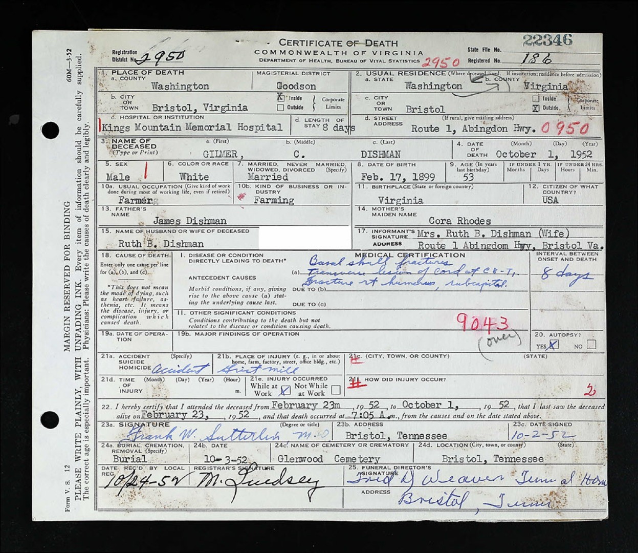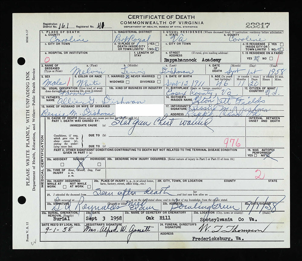 - [S915] Melvin Lewis Dishman, Certificate of Death no. 23217 (1958), Department of Health, Bureau of Vital Statistics.