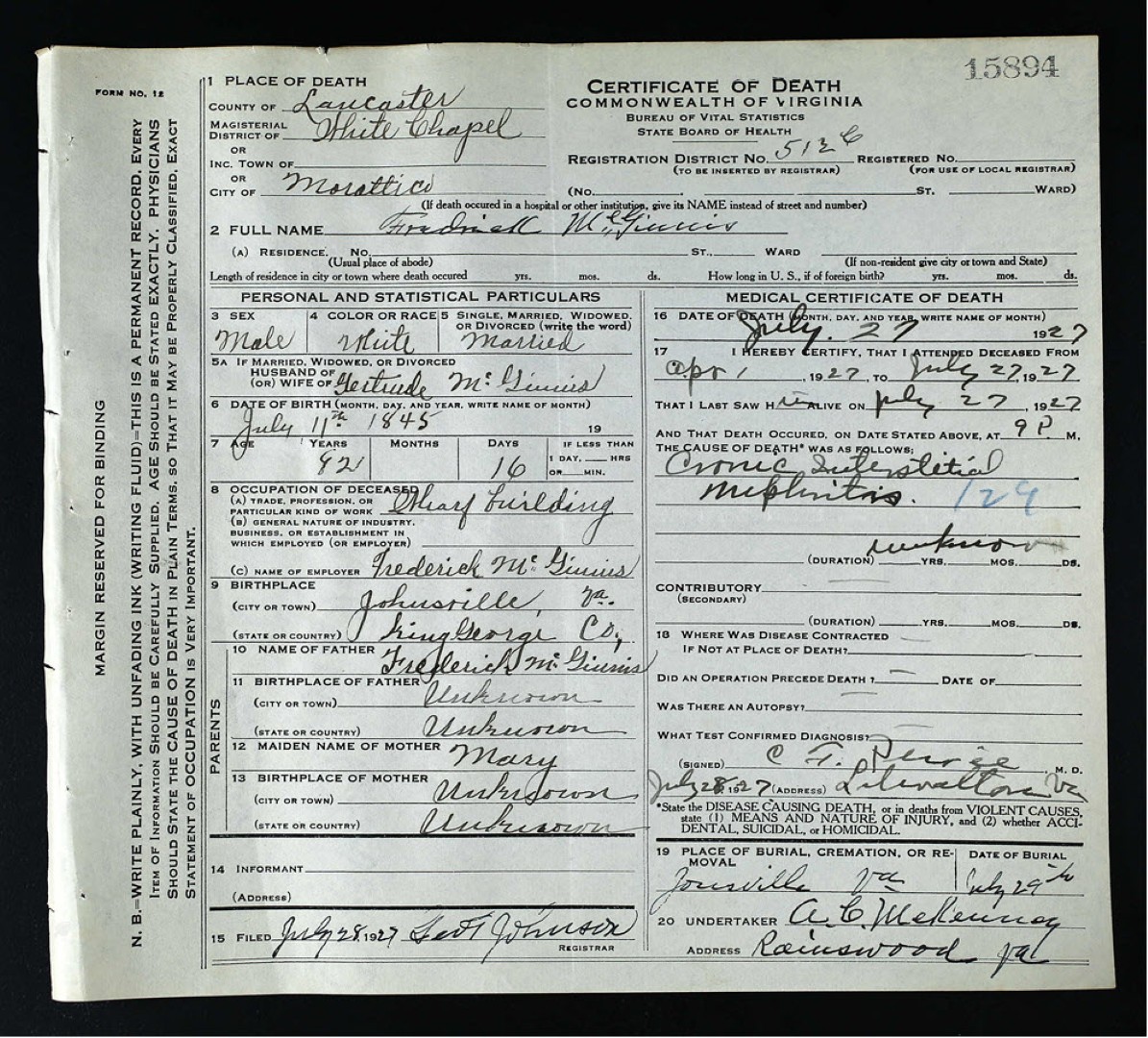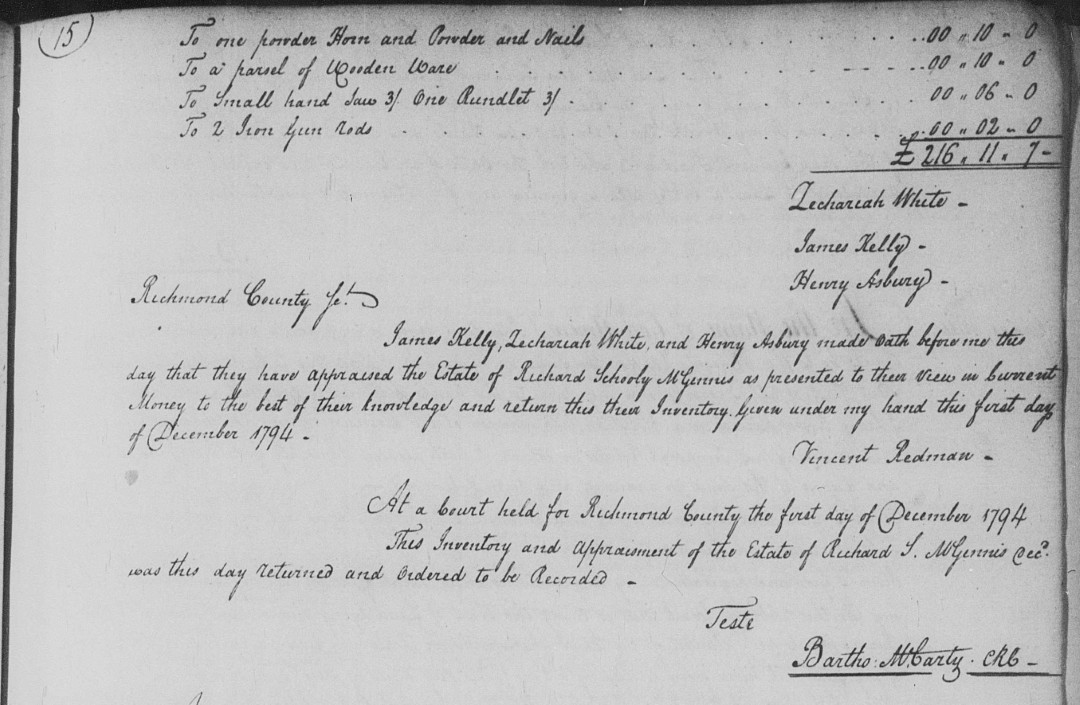 - [S1000] Richmond County, Virginia, Will Book, Vol. 9, 1794-1822: pp. 13-15, Richard Schooly McGinnis inventory, 1 Dec 1794; imaged, FamilySearch (https://www.familysearch.org/ark:/61903/3:1:3Q9M-C9PF-HQV9): accessed 24 Jan 2026), image group number 7646165, images 45-47 of 777.