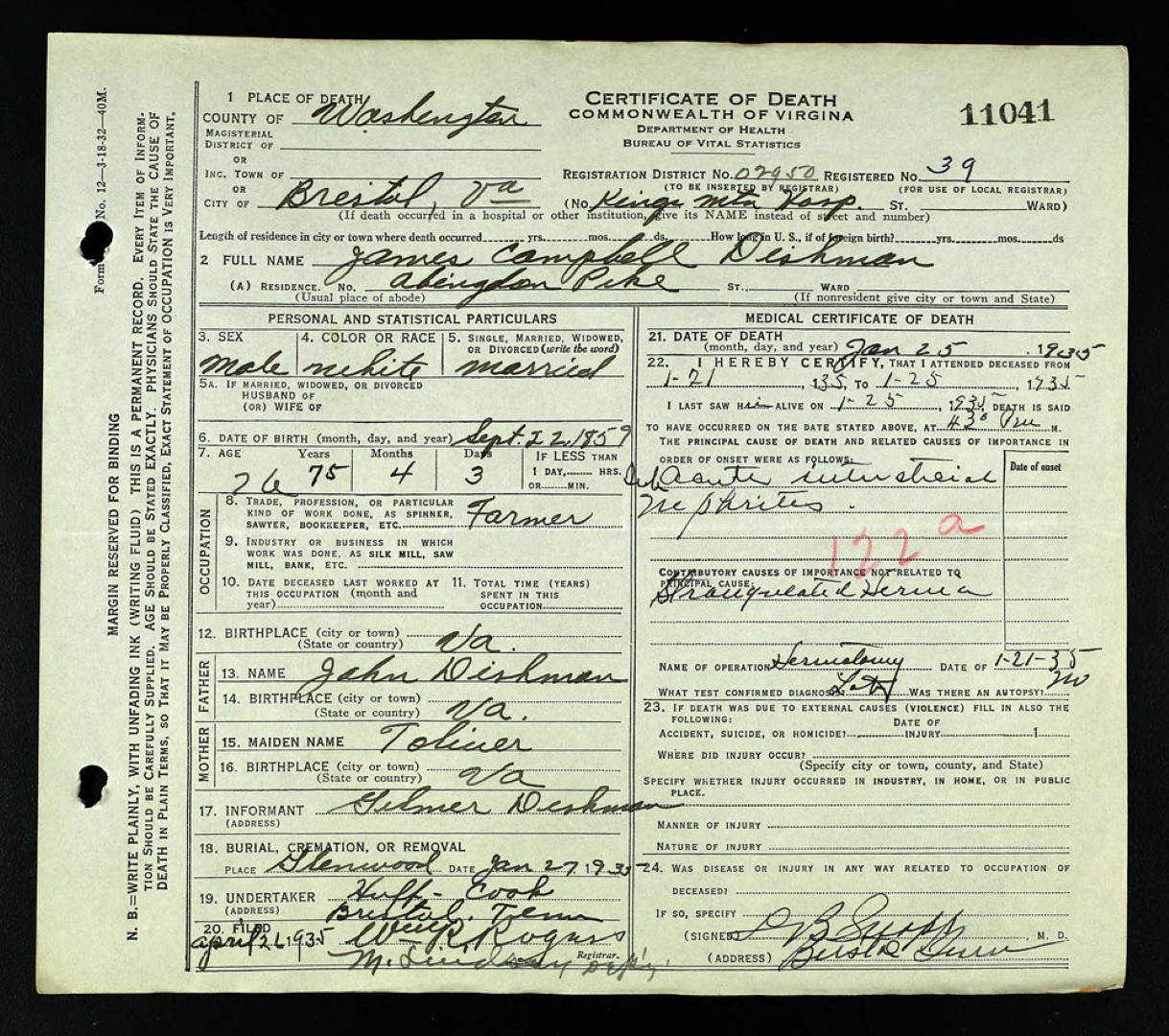 - [S964] James W. Dishman, Certificate of Death no. 42600 (1934), Board of Health, Bureau of Vital Statistics.