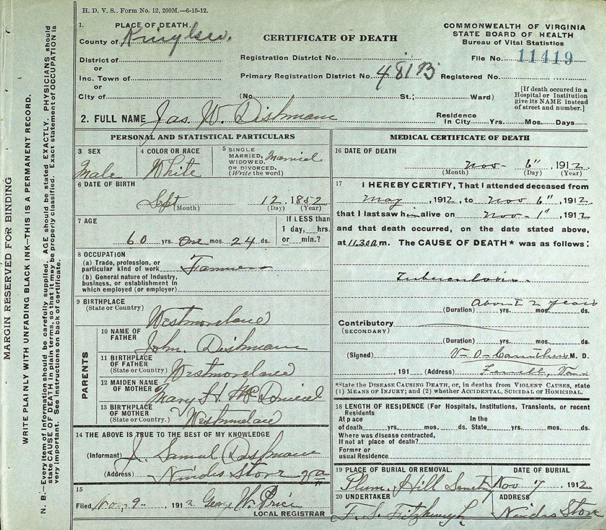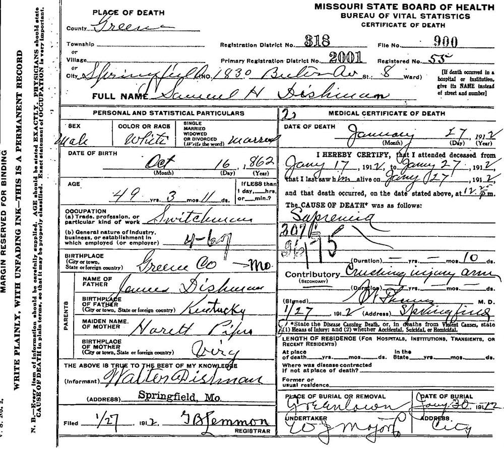 - [S963] Samuel H. Dishman, Certificate of Death no. 900 (1912), Board of Health, Bureau of Vital Statistics.