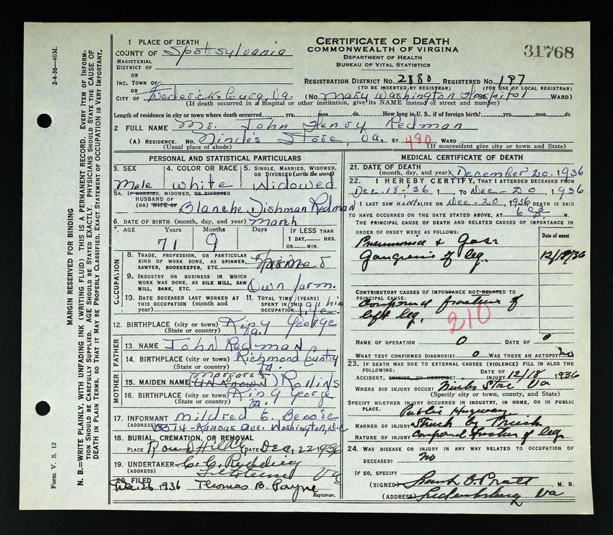 - [S773] "2 New Deaths Added to Toll of State Roads,"John H. Redman death, Richmond Times-Dispatch, Richmond, Virginia, 22 Dec 1936, p.2 (https://www.newspapers.com/image/828024300 : accessed 28 May 2025); citing Newspapers.com.