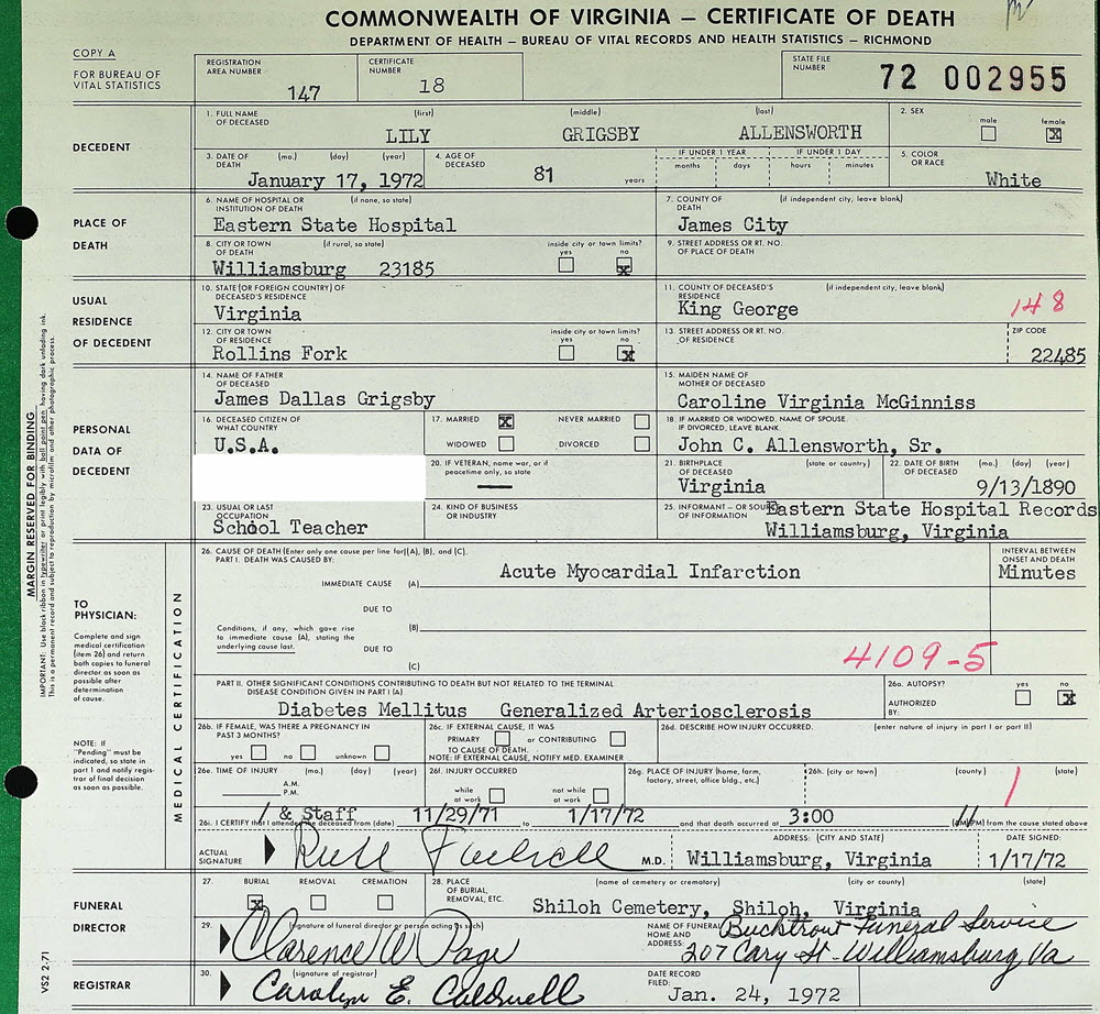 - [S903] Lily Grigsby Allensworth, Certificate of Death no. 72-002955 (1972), Department of Health, Bureau of Vital Statistics.